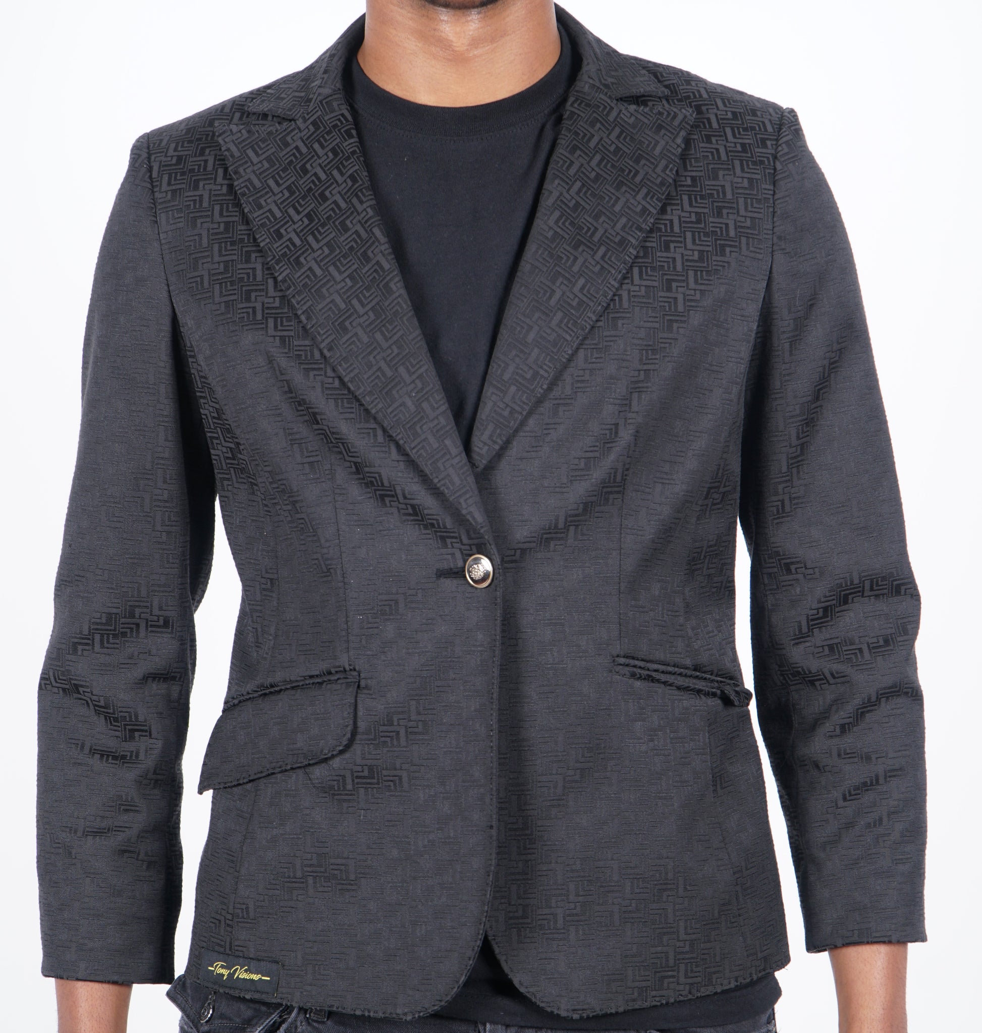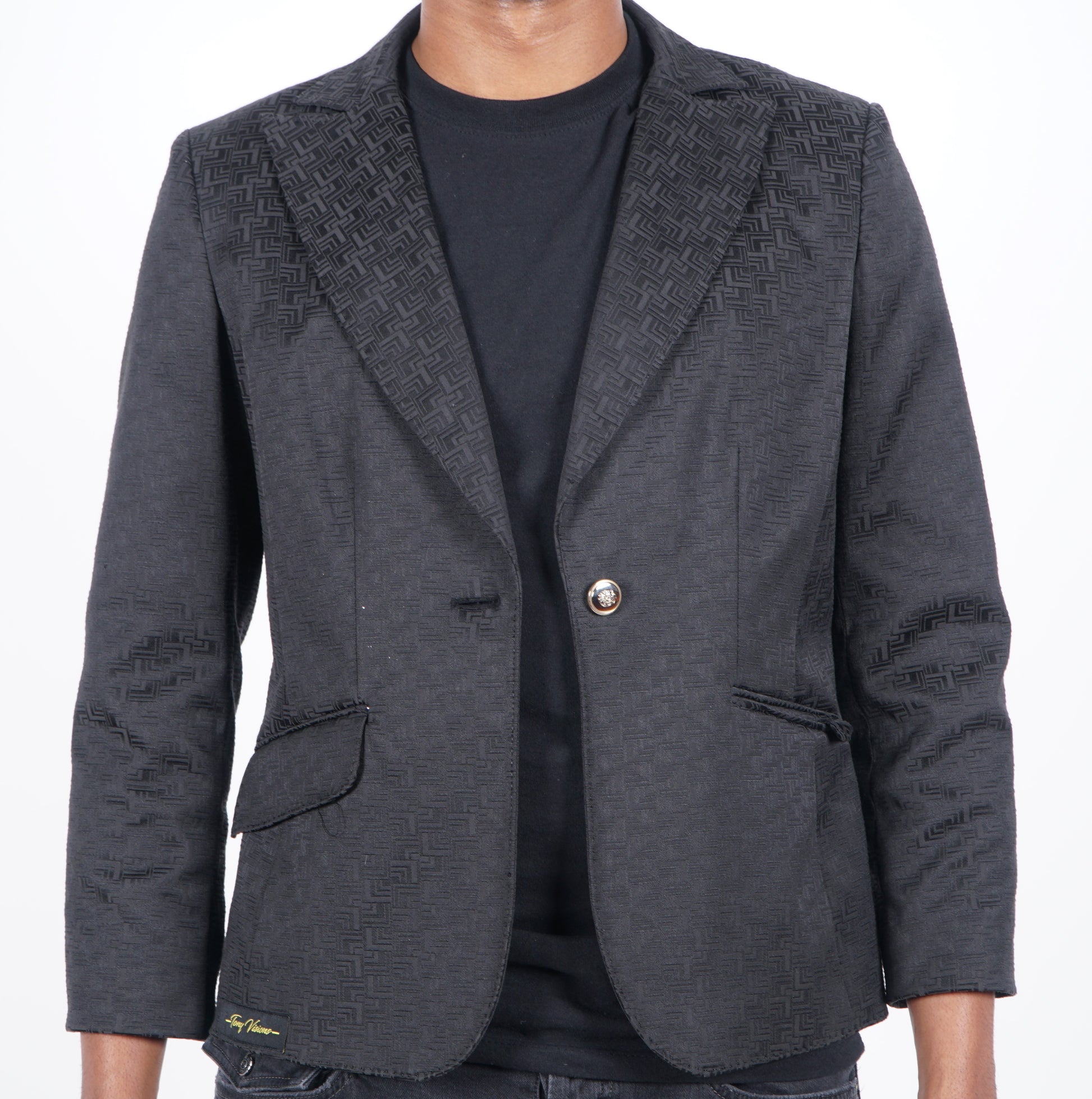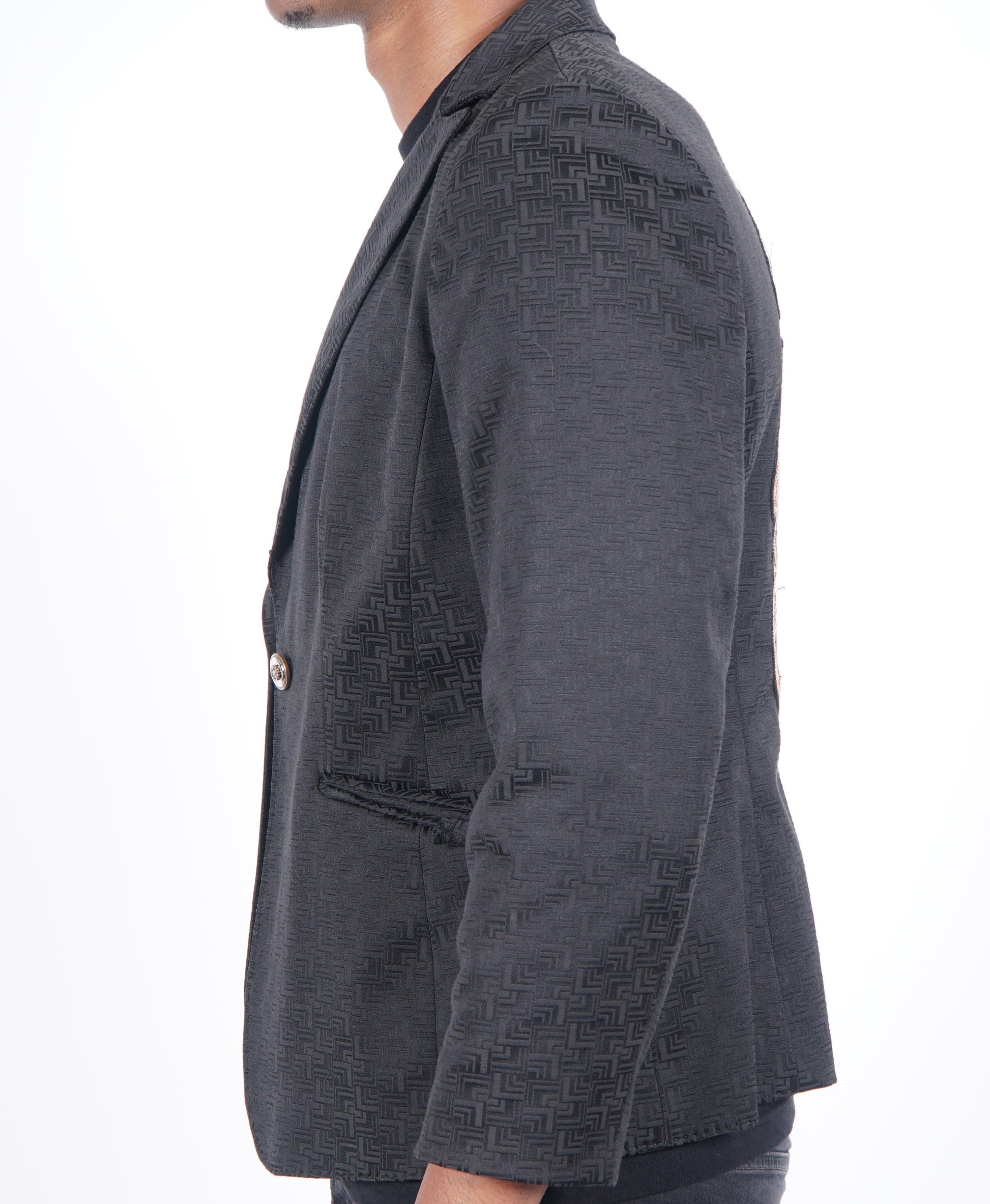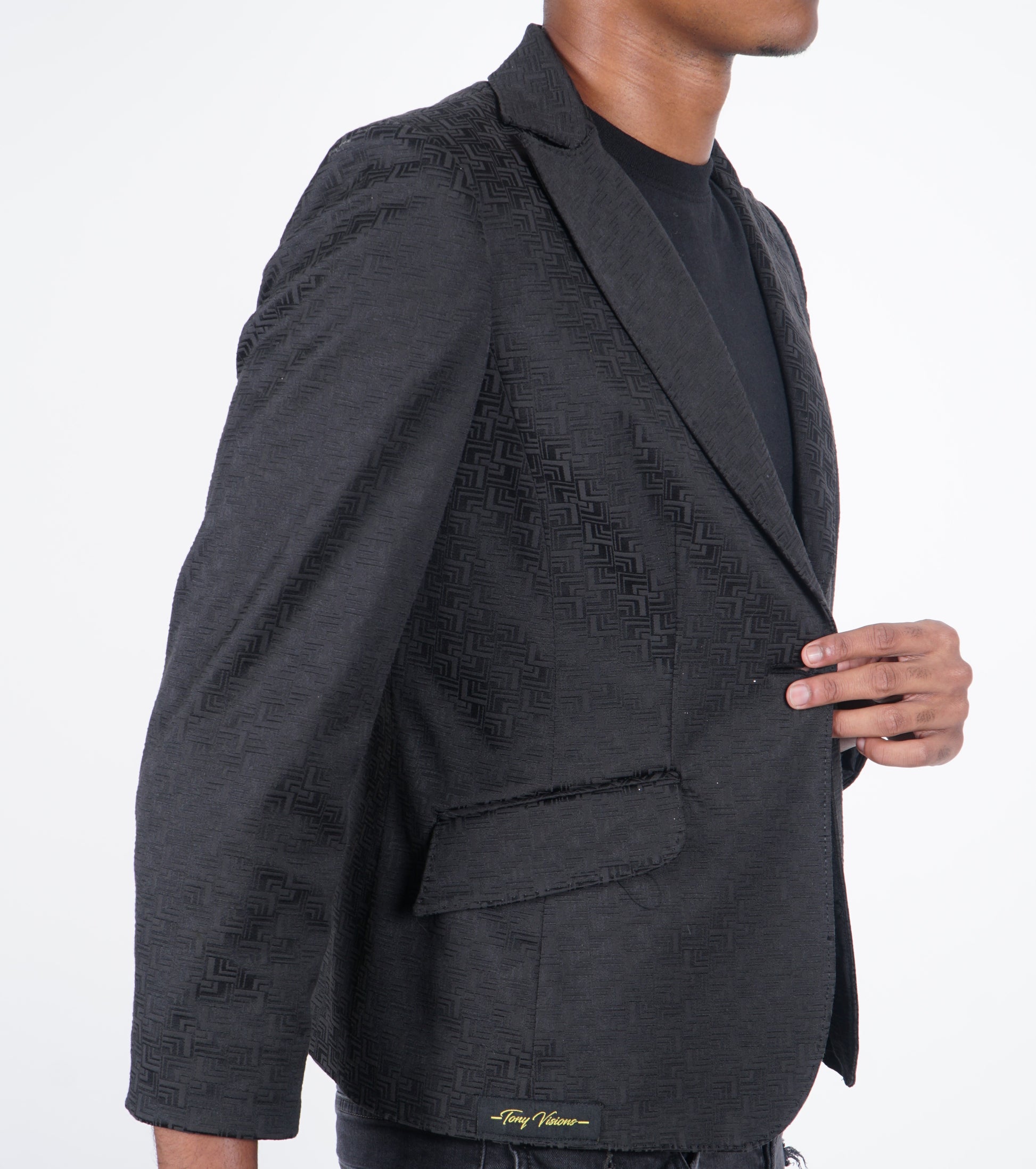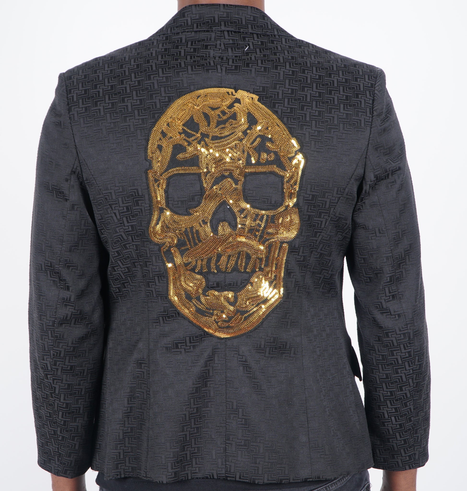 A one of one patterned blazer with a gold embroidered skull on the back.