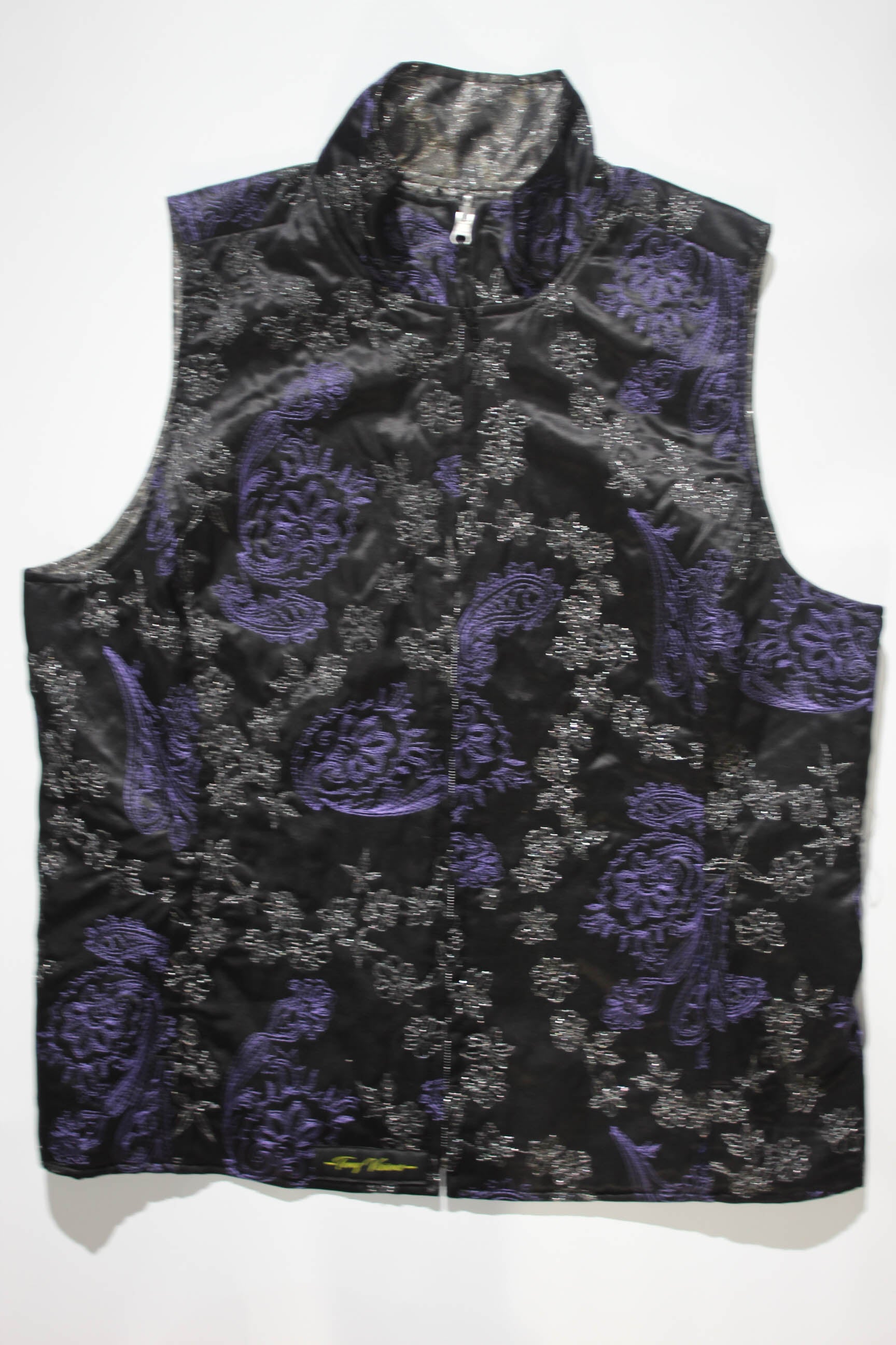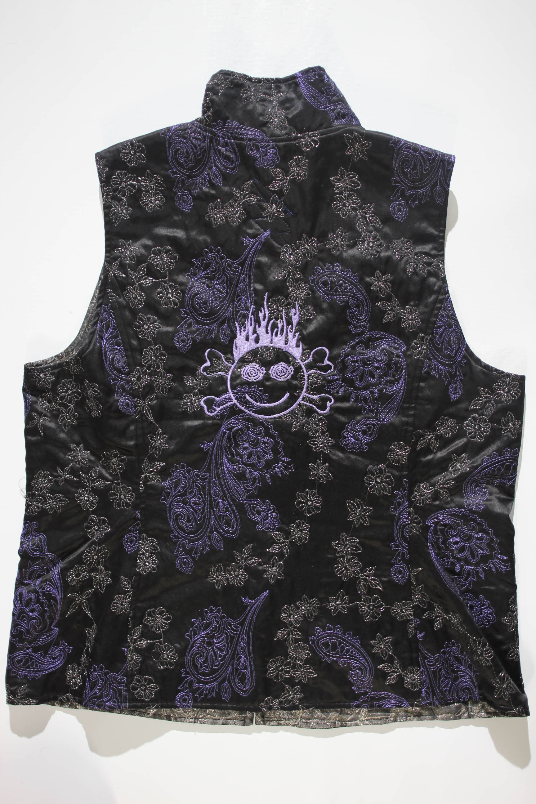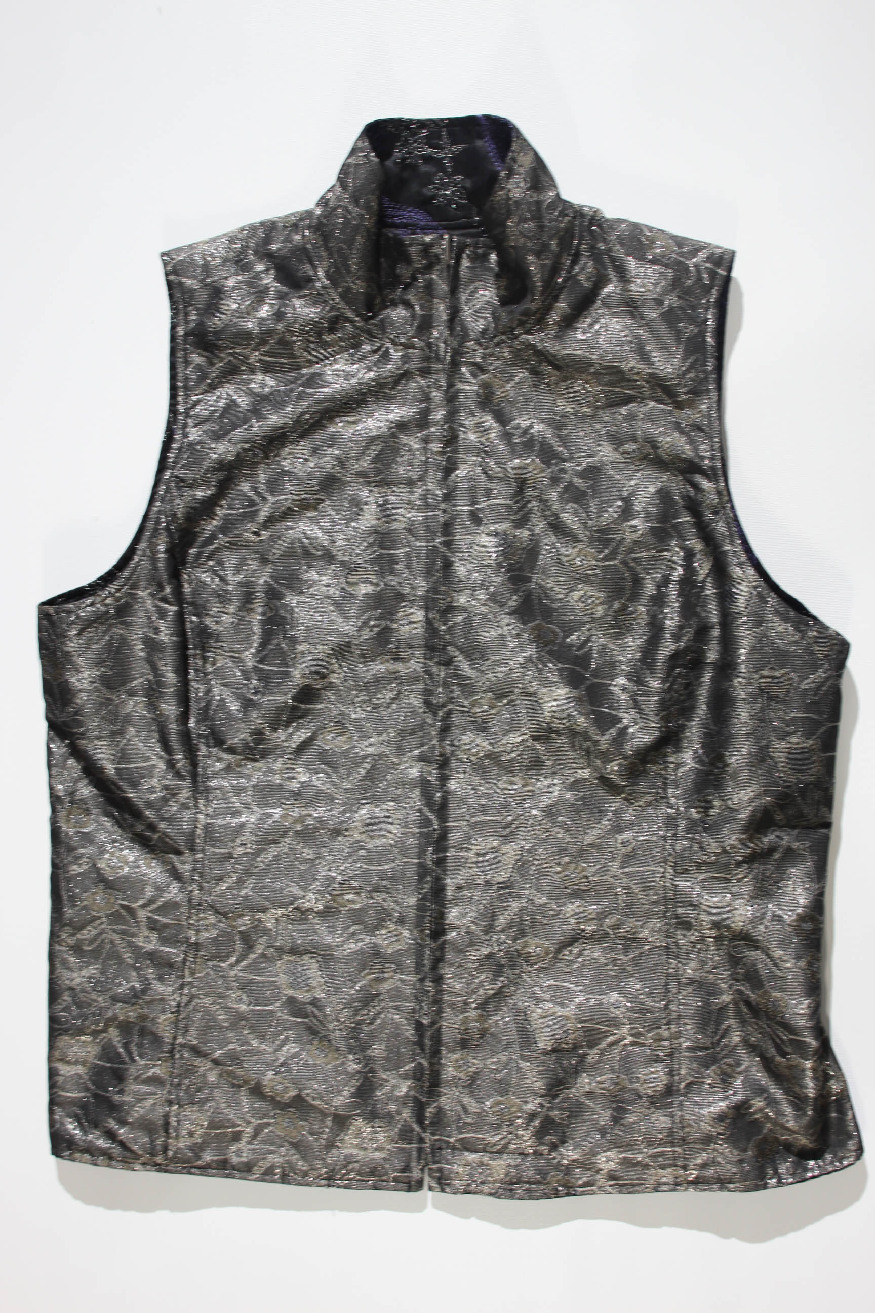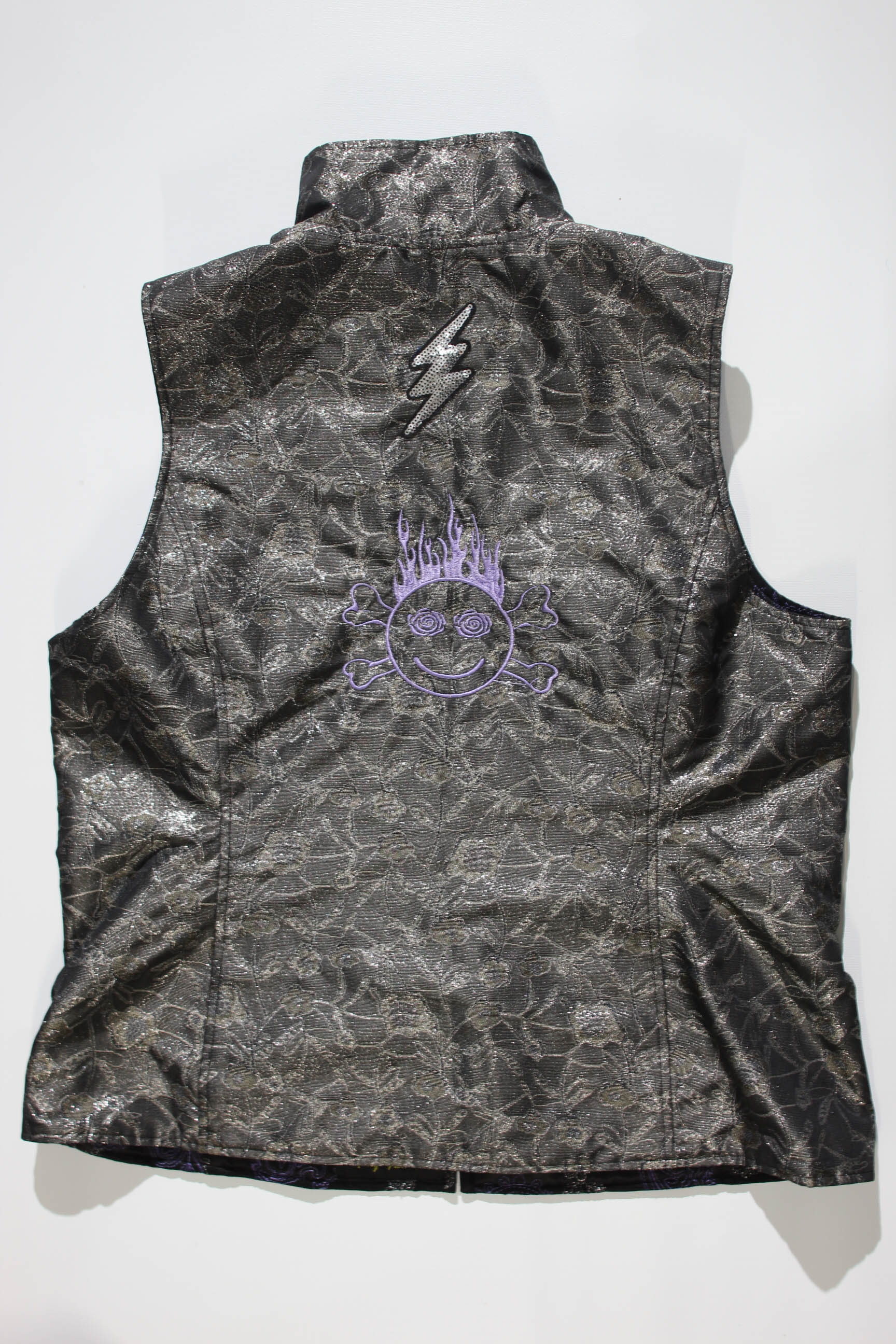 A Custom Reversible fabric vest. One side black/purple and other silver/purple showing color and detail on each side.